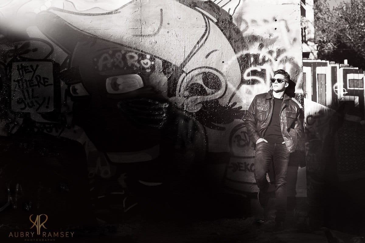 “This all takes an immense amount of communication and getting to know your Senior. As I always do, the first 10 minutes I just hang out and talk to my Senior to reconnect.  The key is for them to be completely relaxed and comfortable, with this big clunky thing we call a camera, in their face for two hours.   I usually give them a quick run down of how the day will go and what I expect from them. I wanted to capture Cooper’s edgy, rocker side so Graffiti park was a perfect fit.  He literally “rocked” this look.  wink wink…  After showing Cooper a few of the pictures, he was like “WOW, that looks great” and instant trust was gained and he became totally relaxed.  Again, there is that whole communication thing…… 😉