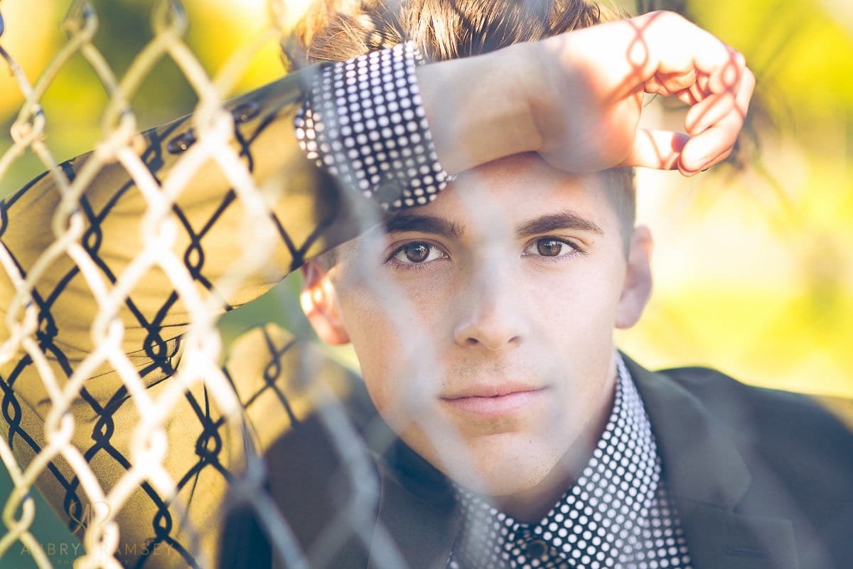 “Next we took it to an old park with a ball field.  I chose this location for many reasons.  First, because it was simple and I wanted Cooper to really POP with this outfit since it had great color.  Also because baseball was a huge part of his high school career.  He didn’t want to do any baseball themed pictures but by having the chain link fence and bleachers in his pictures, it represented that part of his life.  He will be going to Texas A&M and pursuing a career in medicine so the very tailored, almost professional looking, outfit matched with the rugged ball field was a must combination for me!  Cooper’s images turned out perfectly and they truly tell the story of this monumental time in his life, with a hint of what the future holds for him.